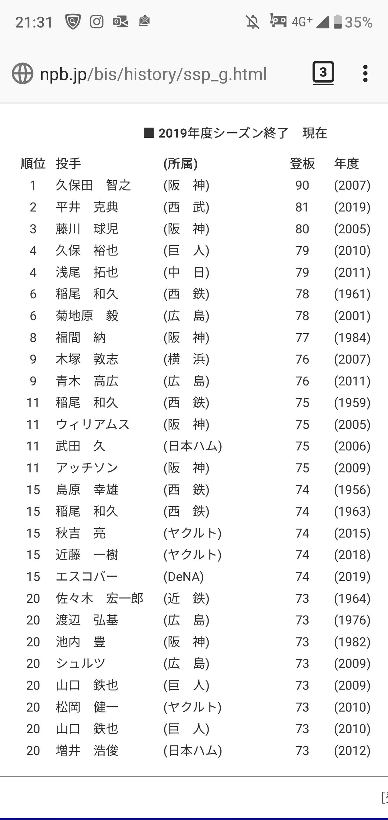 2005年に80登板したのに2019年に56登板してる人が混ざってますね…
