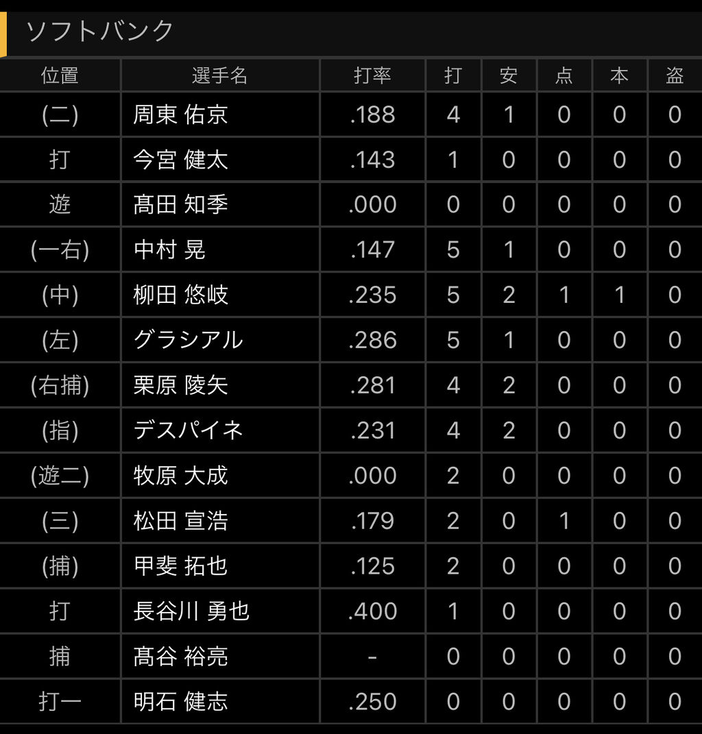 外野 牧原大明石川島グラシアル柳田長谷川中村晃デスパイネ上林真砂釜元周東栗原バレンティン佐藤柳町水谷井上